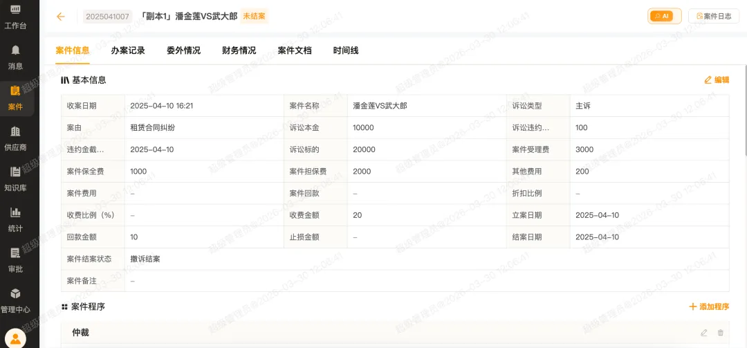 针对跨地域的租金追讨与资产处置案件,集团通过律杏法务云建立了统一的案件管理中心。系统实现了从业务端争议上报、法务立案、委派外部律师、开庭到执行回款的全线上闭环。同时,建立外部律师库,实现一案多角色协同,总部法务可实时总览各地案件全局进展。