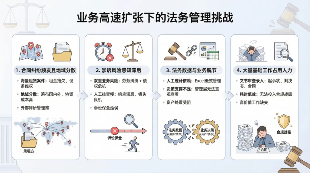 在集团实现高质、高速发展的背后,法务与风控团队面临着巨大的挑战: